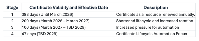 The CA/Browser Forum (CAB) has voted on an evolution of plans to shrink the window. For reference, here is a table: